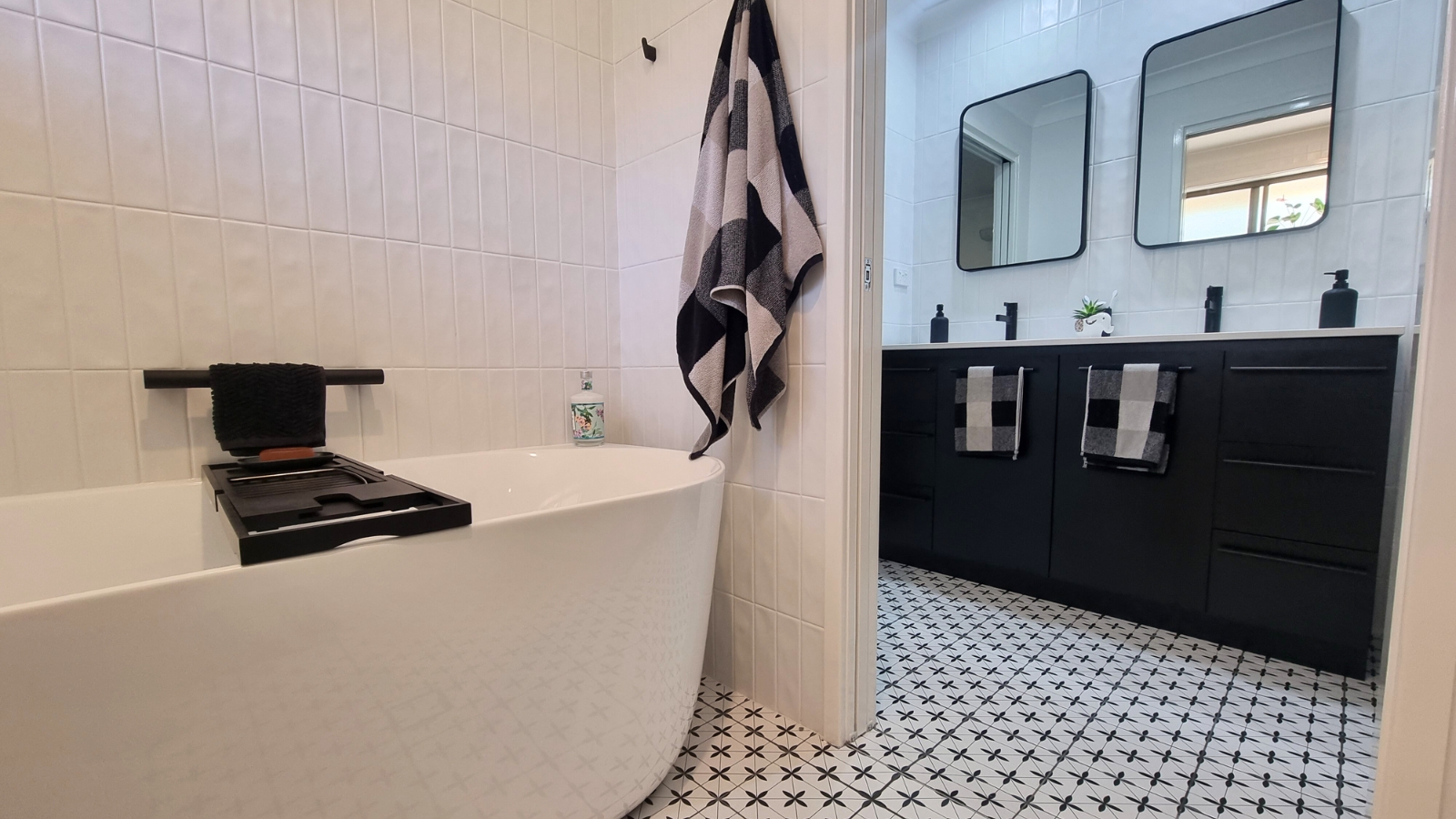 With this renovation our clients knew exactly what they were after and even HAND CRAFTED their own vanity bowl (now, you cannot say that isn’t impressive!), which paired beautifully with the selected feature wall tiles laid in a basket weave pattern!