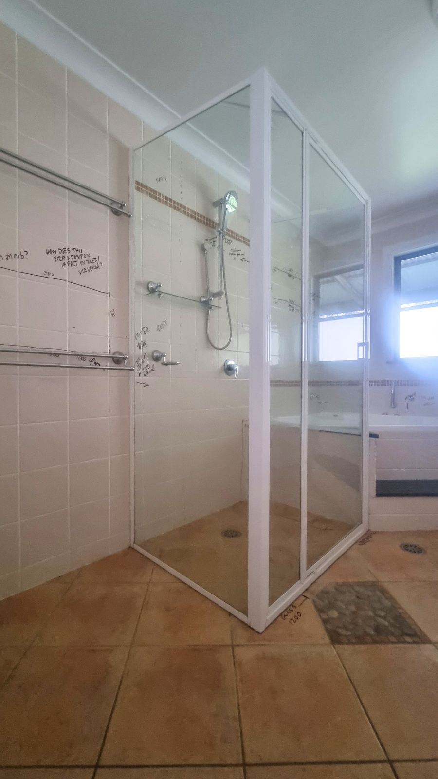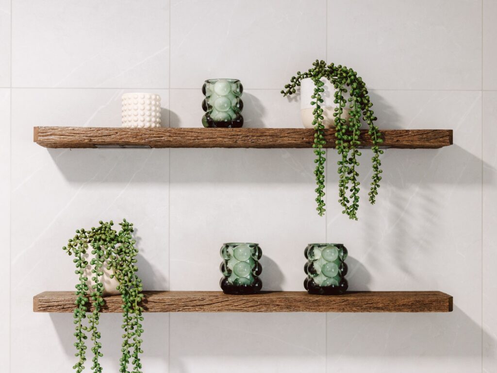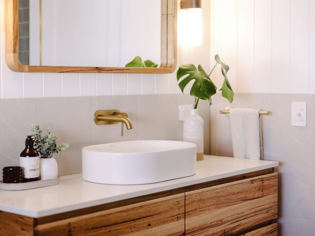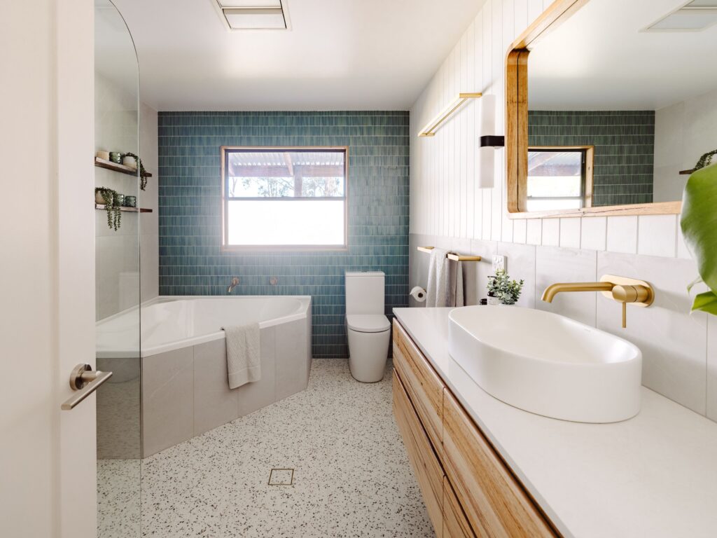 In the main bathroom, improved functionality was paired with a more refined material palette, where mosaic feature tiles, a custom hardwood framed mirror and a radius edge shower screen introduce softness, texture and detail. Repurposed railway sleepers were reimagined as floating vanities, supported by custom-made brackets, bring warmth and individuality, while custom hardwood timber window sills further reinforce the natural material story.