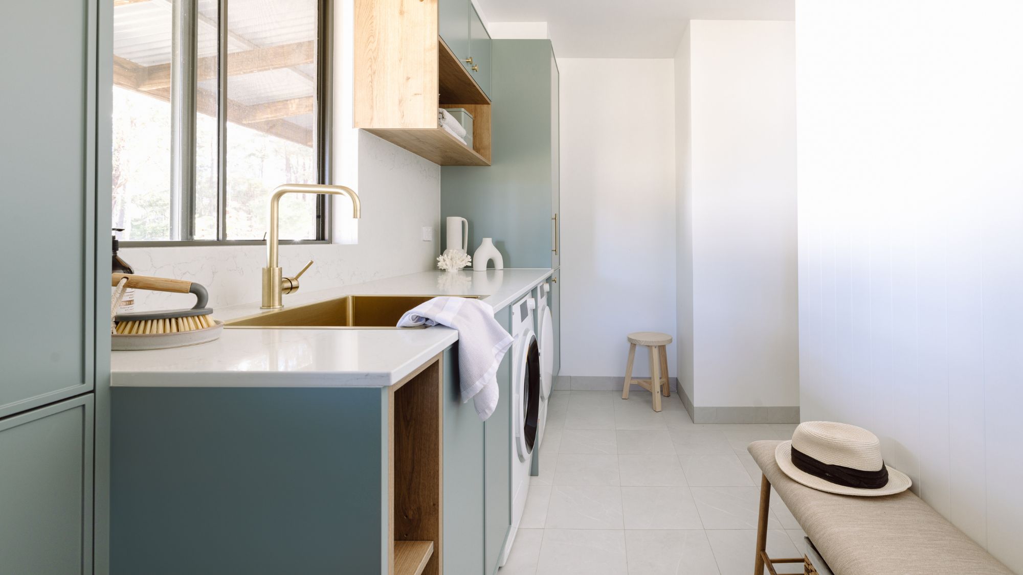 In the laundry, functionality was reimagined within a smaller footprint through custom cabinetry, stone benchtops and splashback, and a new external door configuration that improved flow and usability. Though highly practical, the space was designed with the same level of detail as the bathrooms, ensuring it feels integrated rather than secondary.