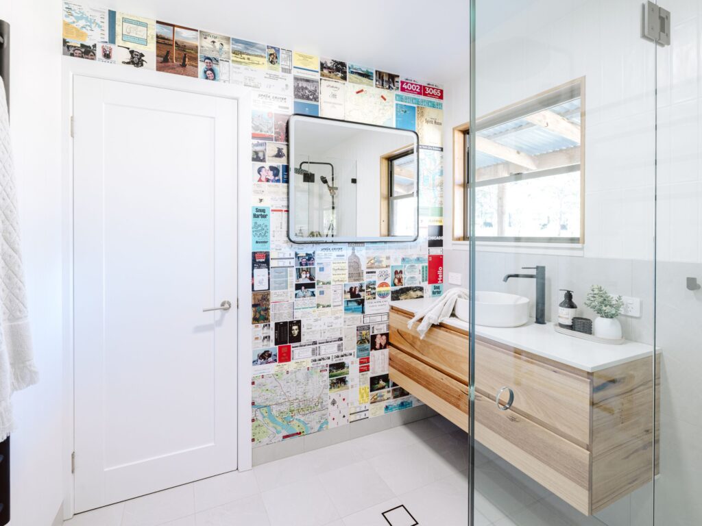 As with many renovations, the craftsmanship lies in the complexity behind the finished result. Challenges included cutting into concrete to relocate the floor waste, moving the ensuite back wall to create more space, installing a new external door and jamb in the laundry, and resolving numerous detailed junctions, including aligning VJ panelling, gyprock, wallpaper and mosaic tiles and skirt tiles to sit flush throughout. Particular care was also required in integrating custom elements, from bespoke brackets for the floating railway sleeper shelves to ensuring the custom wallpaper aligned seamlessly with surrounding finishes. We know that these considered moments, while often subtle, are what gives the project its enduring quality.
