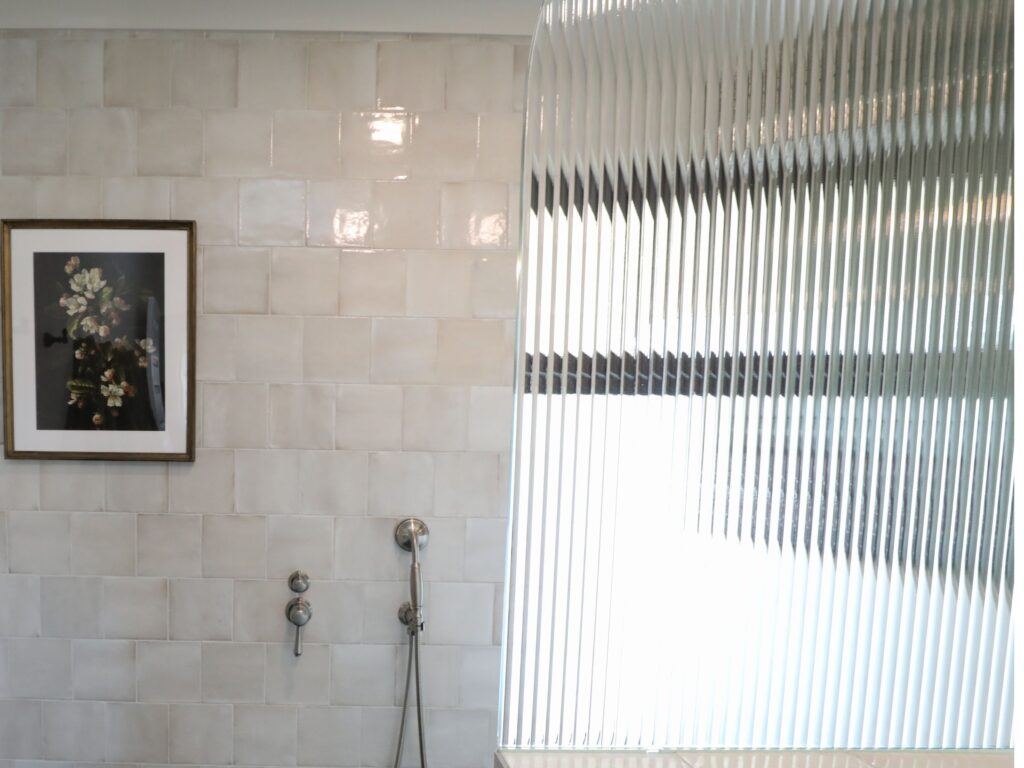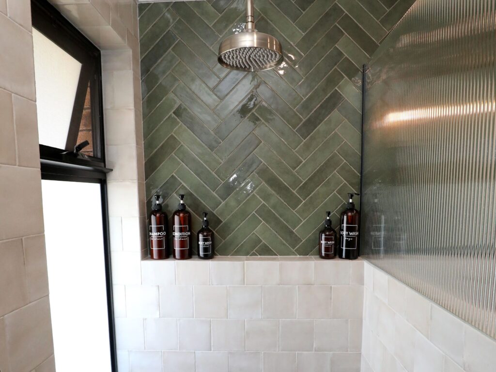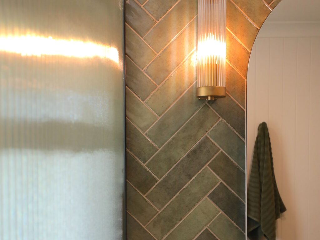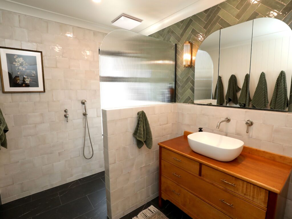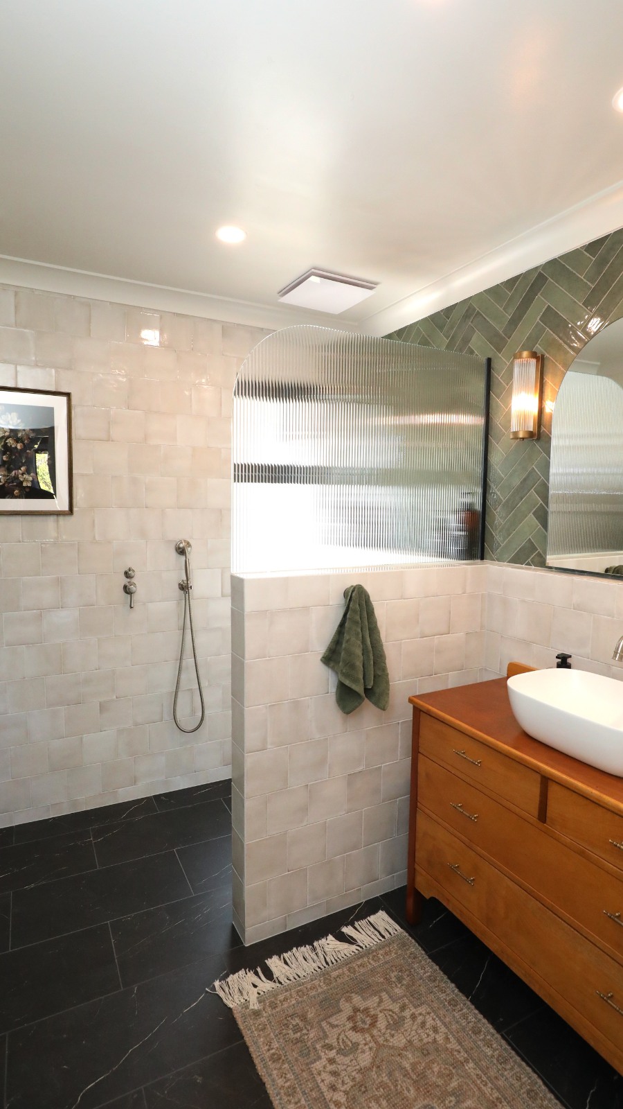 The new main bathroom was designed to increase space and remove the bath, with a material and colour palette that balances softness, texture and individuality. Green-toned herringbone feature tiles pair with undulating zellige-style wall tiles to create movement, while traditional nickel tapware and a custom curved fluted shower screen bring detail and elegance. The fluting detail was echoed in the vintage-inspired fluted glass lighting used across both rooms, creating a sense of cohesion. Adding further character, a repurposed chest of drawers was thoughtfully integrated as a vanity, bringing warmth, sustainability and personality, while features such as mosaic tiling gives this space its distinctive identity.