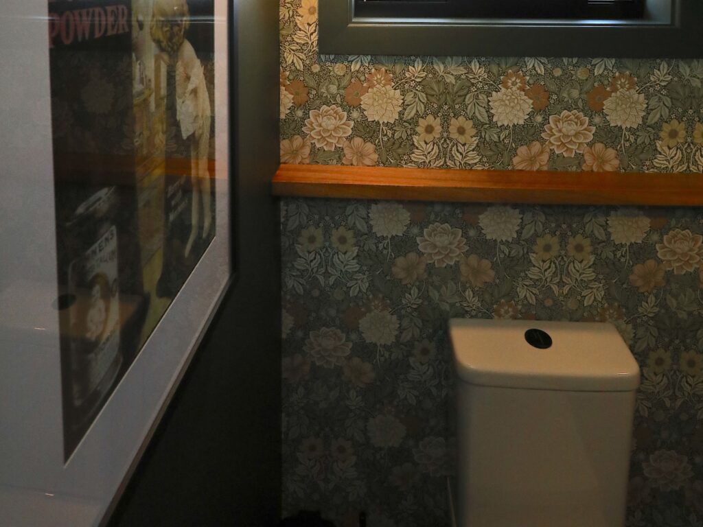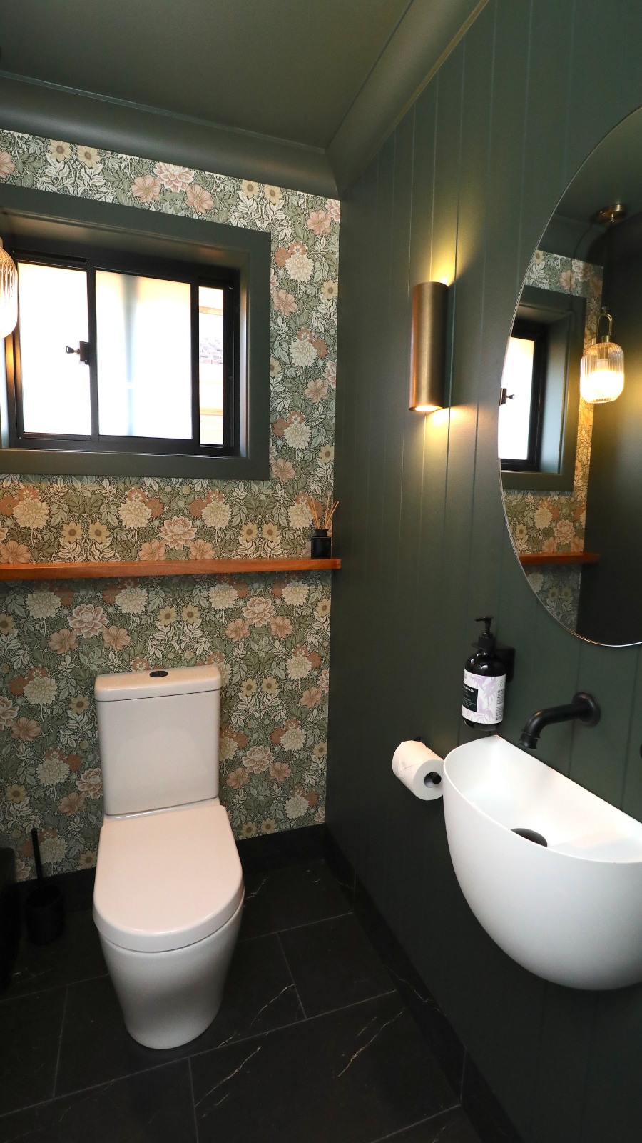 In the powder room, the goal was to create a fun and impactful powder room and to add a sink so it could function separately by itself. The floating timber shelf softens the room. While choosing a moody floral wallpaper and vintage prints bring in bolder design. Further proof that smaller spaces like powder rooms are the perfect place to take creative risks and entertain your guests when they pop to the loo.