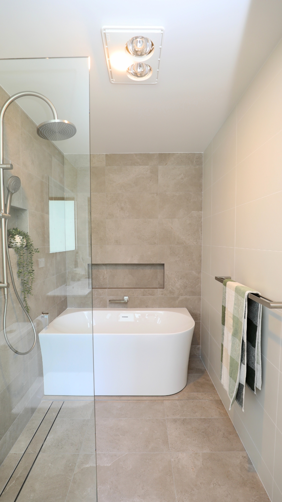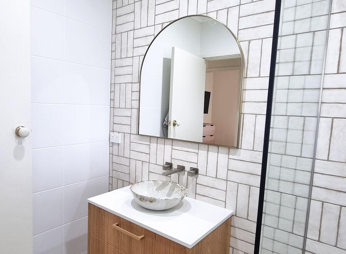 With this renovation our clients knew exactly what they were after and even HAND CRAFTED their own vanity bowl (now, you cannot say that isn’t impressive!), which paired beautifully with the selected feature wall tiles laid in a basket weave pattern!